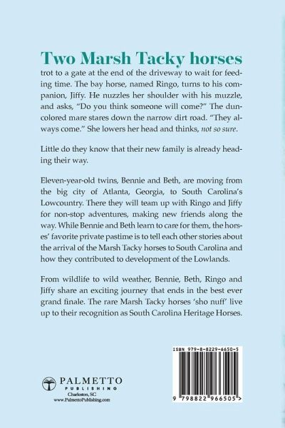 Two Marsh Tacky horses trot to a gate at the end of the driveway to wait for feeding time. The bay horse, named Ringo, turns to his companion, Jiffy. He nuzzles her shoulder with his muzzle, and asks, "Do you think someone will come?" the dun-colored mare stares down the narrow dirt road. "They always come." She lowers her head and thinks, not so sure. Little do they know that their new family is already heading their way. Eleven-year-old twins, Bennie and Beth, are moving from the big city of Atlanta, Georgia, to South Carolina's Lowcountry. There they will team up with Ringo and Jiffy for non-stop adventures, making new friends along the way. While Bennie and Beth learn to care for them, the horses' favorite pastime is to tell each other stories about the arrival of the Marsh Tacky horses to South Carolina and how they contributed to development of the Lowlands. From wildlife to wild weather, Bennie, Beth, Ringo and Jiffy share an exciting journey that ends in the best ever grand finale. The rare Marsh Tacky horses 'sho nuff' live up to their recognition as South Carolina Heritage Horses.