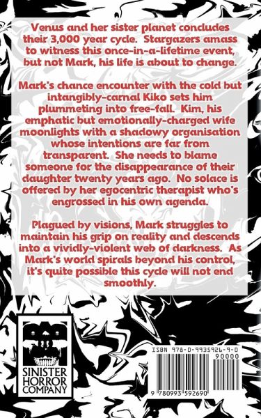 Venus and her sister planet concludes their 3,000 year cycle. Stargazers amass to witness this once-in-a-lifetime event, but not Mark, his life is about to change. Mark's chance encounter with the cold but intangibly-carnal Kiko sets him plummeting into free-fall. Kim, his emphatic but emotionally-charged wife moonlights with a shadowy organisation whose intentions are far from transparent. She needs to blame someone for the disappearance of their daughter twenty years ago. No solace is offered by her egocentric therapist who's engrossed in his own agenda. Plagued by visions, Mark struggles to maintain his grip on reality and descends into a vividly-violent web of darkness. As Mark's world spirals beyond his control, it's quite possible this cycle will not end smoothly.