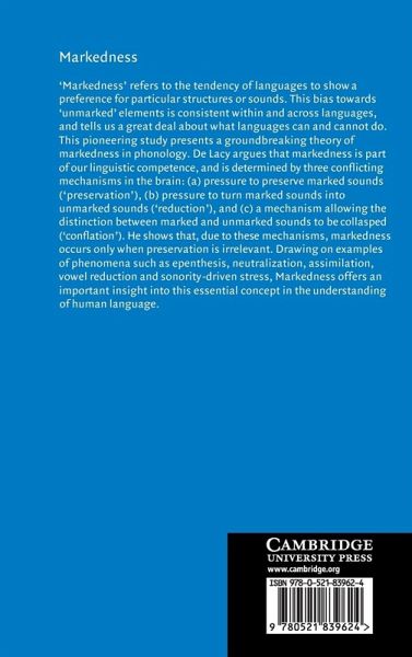 'Markedness' refers to the tendency of languages to show a preference for particular structures or sounds. This bias towards 'marked' elements is consistent within and across languages, and tells us a great deal about what languages can and cannot do. This pioneering study presents a groundbreaking theory of markedness in phonology. De Lacy argues that markedness is part of our linguistic competence, and is determined by three conflicting mechanisms in the brain: (a) pressure to preserve marked sounds ('preservation'), (b) pressure to turn marked sounds into unmarked sounds ('reduction'), and (c) a mechanism allowing the distinction between marked and unmarked sounds to be collapsed ('conflation'). He shows that due to these mechanisms, markedness occurs only when preservation is irrelevant. Drawing on examples of phenomena such as epenthesis, neutralisation, assimilation, vowel reduction and sonority-driven stress, Markedness offers an important insight into this essential concept in the understanding of human language.