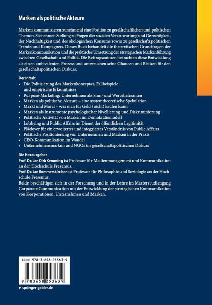 -Die Wechselbeziehung von Politik und Marken-Marken als politische Akteure und engagierte Bürger in der Demokratie-Die gesellschaftliche Rolle von Marken in der Systemtheorie-Die gesellschaftliche Rolle von Marken im kommunikativen Konstruktivismus-Moralische Marken als soziale Akteure-Marken und Kultur - historische Entwicklung und theoretischer Ausblick-Die Politisierung der CSR-Marken zwischen Lobbying und Public Affairs-Der CEO als politischer Leuchtturm und Aktivist der Marke-Purpose Branding und Brand Activism-Agenda Surfing und politische Achtsamkeit - Marken und Politik im Marketing-Agenturen als Werber und Kommunikator