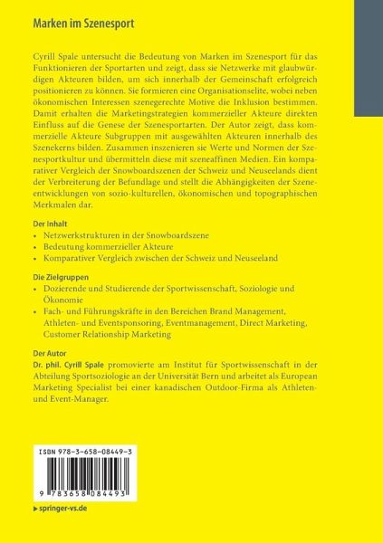 Cyrill Spale untersucht die Bedeutung von Marken im Szenesport für das Funktionieren der Sportarten und zeigt, dass sie Netzwerke mit glaubwürdigen Akteuren bilden, um sich innerhalb der Gemeinschaft erfolgreich positionieren zu können. Sie formieren eine Organisationselite, wobei neben ökonomischen Interessen szenegerechte Motive die Inklusion bestimmen. Damit erhalten die Marketingstrategien kommerzieller Akteure direkten Einfluss auf die Genese der Szenesportarten. Der Autor zeigt, dass kommerzielle Akteure Subgruppen mit ausgewählten Akteuren innerhalb des Szenekerns bilden. Zusammen inszenieren sie Werte und Normen der Szenesportkultur und übermitteln diese mit szeneaffinen Medien. Ein komparativer Vergleich der Snowboardszenen der Schweiz und Neuseelands dient der Verbreiterung der Befundlage und stellt die Abhängigkeiten der Szeneentwicklungen von sozio-kulturellen, ökonomischen und topographischen Merkmalen dar.