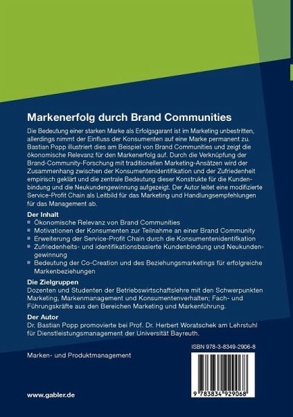 Die Bedeutung einer starken Marke als Erfolgsgarant ist im Marketing unbestritten, allerdings nimmt der Einfluss der Konsumenten auf eine Marke permanent zu. Bastian Popp illustriert dies am Beispiel von Brand Communities und zeigt die ökonomische Relevanz für den Markenerfolg auf. Durch die Verknüpfung der Brand-Community-Forschung mit traditionellen Marketing-Ansätzen wird der Zusammenhang zwischen der Konsumentenidentifikation und der Zufriedenheit empirisch geklärt und die zentrale Bedeutung dieser Konstrukte für die Kundenbindung und die Neukundengewinnung aufgezeigt. Der Autor leitet eine modifizierte Service-Profit Chain als Leitbild für das Marketing und Handlungsempfehlungen für das Management ab.