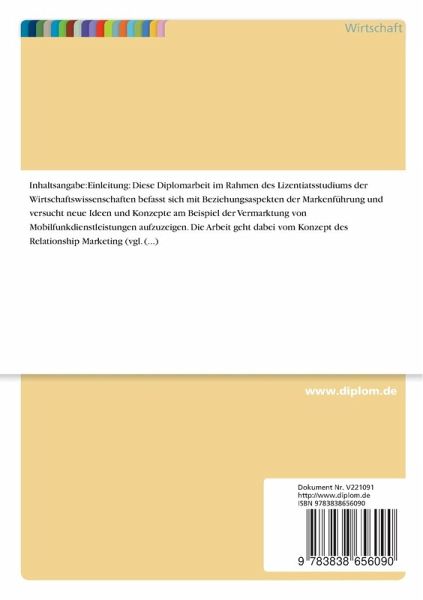 Diese Diplomarbeit im Rahmen des Lizentiatsstudiums der Wirtschaftswissenschaften befasst sich mit Beziehungsaspekten der Markenführung und versucht neue Ideen und Konzepte am Beispiel der Vermarktung von Mobilfunkdienstleistungen aufzuzeigen.