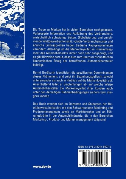 Bernd Großkurth identifiziert die spezifischen Determinanten dieses Phänomens und zeigt ihr Beziehungsgeflecht sowohl untereinander als auch in Hinblick auf die Markenloyalität auf. Anschließend leitet er Empfehlungen ab, auf welche Weise Automobilhersteller die Markenloyalität ihrer Kunden auch unter den derzeitigen Rahmenbedingungen sichern bzw. steigern können.