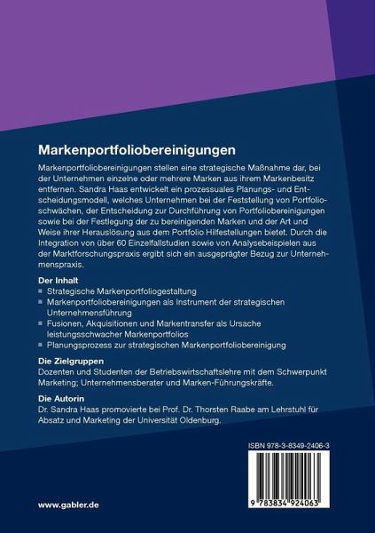 Markenportfoliobereinigungen stellen eine strategische Maßnahme dar, bei der Unternehmen einzelne oder mehrere Marken aus ihrem Markenbesitz entfernen. Sandra Haas entwickelt ein prozessuales Planungs- und Entscheidungsmodell, welches Unternehmen bei der Feststellung von Portfolioschwächen, der Entscheidung zur Durchführung von Portfoliobereinigungen sowie bei der Festlegung der zu bereinigenden Marken und der Art und Weise ihrer Herauslösung aus dem Portfolio Hilfestellungen bietet. Durch die Integration von über 60 Einzelfallstudien sowie von Analysebeispielen aus der Marktforschungspraxis ergibt sich ein ausgeprägter Bezug zur Unternehmenspraxis.