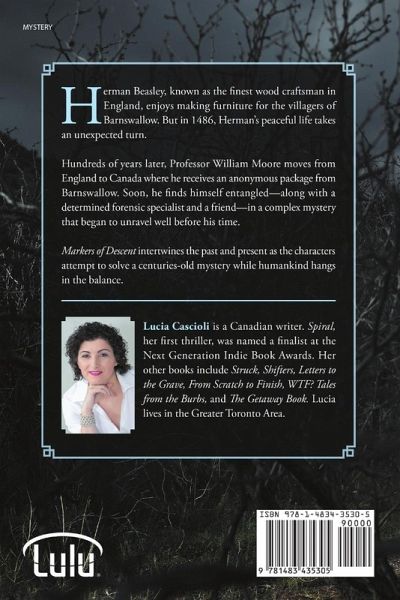 Herman Beasley, known as the finest wood craftsman in England, enjoys making furniture for the villagers of Barnswallow. But in 1486, Herman's peaceful life takes an unexpected turn. Hundreds of years later, Professor William Moore moves from England to Canada where he receives an anonymous package from Barnswallow. Soon, he finds himself entangled-along with a determined forensic specialist and a friend-in a complex mystery that began to unravel well before his time. Markers of Descent intertwines the past and present as the characters attempt to solve a centuries-old mystery while humankind hangs in the balance. Lucia Cascioli is a Canadian writer. Spiral, her first thriller, was named a finalist at the Next Generation Indie Book Awards. Her other books include Struck, Shifters, Letters to the Grave, From Scratch to Finish, WTF? Tales from the Burbs, and The Getaway Book. Lucia lives in the Greater Toronto Area.