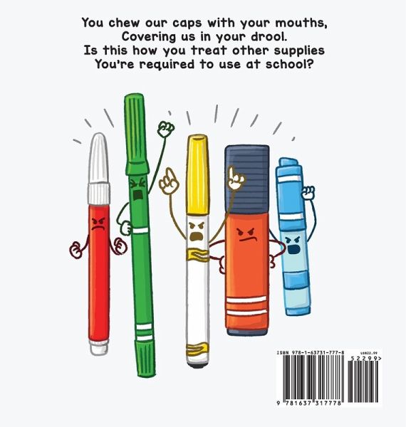 Teaches responsibility and respect for people and things. A hilarious, rhyming, read loud book that's perfect for the first or any day of school. The classroom markers have had enough! When most people think of markers, They think of color, brightness and joy. We're tools for creativity, Maybe your favorite pastime toy. Buy this book for a good laugh, nighttime snuggle, or your favorite teacher.