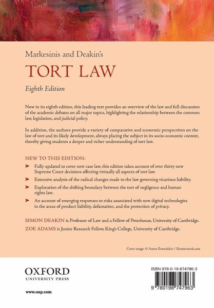 Markesinis and Deakin's Tort Law is an authoritative, analytical, and well-established textbook, now in its eighth edition. The authors provide a variety of comparative and economic perspectives on the law of tort and its likely development, placing the subject in its socio-economic context, giving students a deeper understanding of tort law.