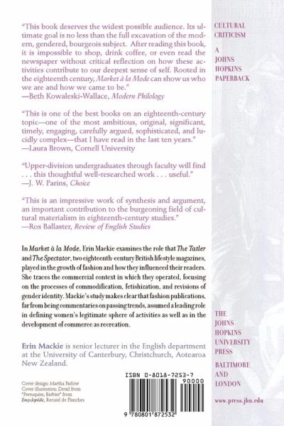 How eighteenth-century fashion publications assumed a leading role in defining women's legitimate sphere of activities. In Market à la Mode, Erin Mackie examines the role that The Tatler and The Spectator, two eighteenth-century British lifestyle magazines, played in the growth of fashion and how they influenced their readers. She traces the commercial context in which they operated, focusing on the processes of commodification, fetishization, and revisions of gender identity. Mackie's study makes clear that fashion publications, far from being commentaries on passing trends, assumed a leading role in defining women's legitimate sphere of activities as well as in the development of commerce as recreation.