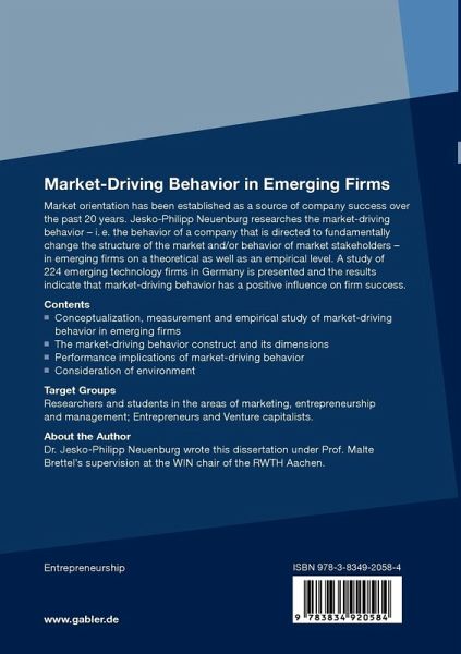 Among researchers the concept of market orientation has been broadly discussed for many years stimulated above all by the works of Kohli and Jaworski as well as Narver and Slater. These authors managed to define and operationalize the concept of market orientation in different ways and also empirically confirmed a positive performance impact of a company's market orientation. Likewise it could be shown that for emerging firms market oriented behavior can influence between 20-25% of company success. In addition it has been researched which management measures and which aspects of a company's culture foster this behavior in young, innovative firms. At the same time it should be noted that especially these young, innovative companies often create new markets with their innovative products and that (potential) customers only learn about the product when it is introduced to the market. It is questionable how a market oriented company can be successful in such a situation. Information cannot be generated from the customer and hence also cannot be disseminated or processed. These doubts form the basis for the idea of a "market-driving behavior". This is defined as a company's ability to create or influence markets. To date it is, however, unclear how such a behavior should be designed and under which circumstances it contributes to the success of young, innovative companies This is the focus area of this dissertation by Jesko Neuenburg. Its objective is to research the so called market driving behavior (MDB). Mr.