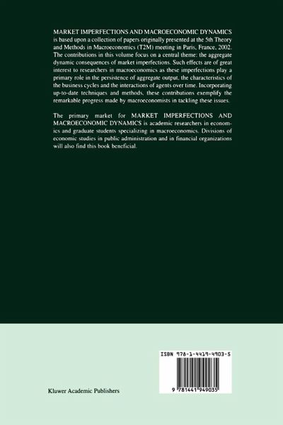 Market Imperfections and Macroeconomic Dynamics is based upon a collection of papers originally presented at the 5th Theory and Methods in Macroeconomics (T2M) meeting in Paris, France, 2002. The contributions in this volume focus on a central theme: the aggregate dynamic consequences of market imperfections. Such effects are of great interest to researchers in macroeconomics as these imperfections play a primary role in the persistence of aggregate output, the characteristics of the business cycles and the interactions of agents over time. Incorporating up-to-date techniques and methods, these contributions exemplify the remarkable progress made by macroeconomists in tackling these issues.