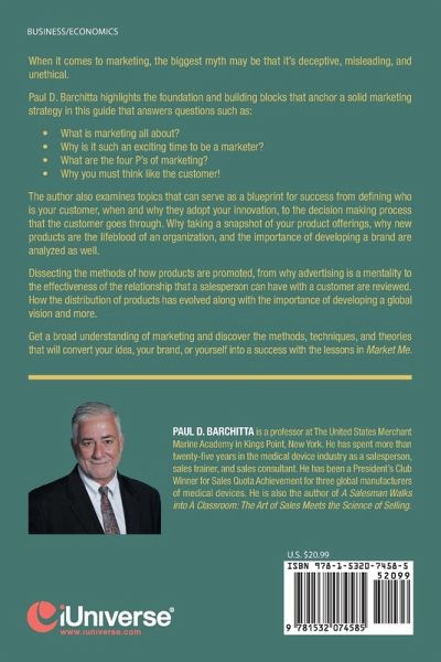 When it comes to marketing, the biggest myth may be that it's deceptive, misleading, and unethical. Paul D. Barchitta highlights the foundation and building blocks that anchor a solid marketing strategy in this guide that answers questions such as: ¿ What is marketing all about? ¿ Why is it such an exciting time to be a marketer? ¿ What are the four P's of marketing? ¿ Why you must think like the customer! The author also examines topics that can serve as a blueprint for success from defining who is your customer, when and why they adopt your innovation, to the decision making process that the customer goes through. Why taking a snapshot of your product offerings, why new products are the lifeblood of an organization, and the importance of developing a brand are analyzed as well. Dissecting the methods of how products are promoted, from why advertising is a mentality to the effectiveness of the relationship that a salesperson can have with a customer are reviewed. How the distribution of products has evolved along with the importance of developing a global vision and more. Get a broad understanding of marketing and discover the methods, techniques, and theories that will convert your idea, your brand, or yourself into a success with the lessons in Market Me.