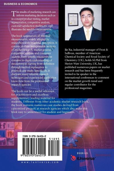 The results of marketing research can inform marketing decisions such as in concept/product testing, market segmentation, competitive analysis, customer satisfaction studies, etc. and illustrates the need for measurement. The book summarizes all essential measurements widely adopted by researchers with insightful perception. It consists of three indispensable sections of market research: market general, competitor analysis, and consumer analysis. Each specific measurement contains in-depth understanding of measurement starting from definition through method explanation to practical case study. Specifically, it discloses many valuable research techniques and experienced application know-how from the professional research agencies. The book can be a useful reference for practitioners and excellent supplementary reading material for students. Different from other academic market research book, the book contains numerous case studies derived from customized projects at research agencies which also make this book easy to understand for student and beginners.