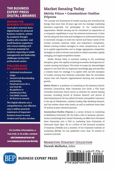 The concept and framework of market sensing was introduced by George Day more than 20 years ago into the strategic marketing literature-especially the philosophy of the market-driven organization. Market sensing can be considered an expression of a company's capabilities to scan the external environment. It does this by using real time data and intelligence to understand business or uncertain changes, to meet the current and future needs of the market, increase customer value, and outperform competitors. Market sensing enables managers to resist complacency, as well as to exploit opportunities and to design appropriate competitive strategies in order to remain successful in today's uncertain, rapidly changing, and hypercompetitive market. Market Sensing Today is essential reading in the marketing discipline, given the rapidly escalating innovative developments in market sensing techniques. This book of essays by acknowledged experts in the field fills an important knowledge gap and provides a realistic basis for strategy. It is replete with real-life examples of market sensing that illustrate actionable ideas for immediate impact that will improve organizational learning and accelerate growth.