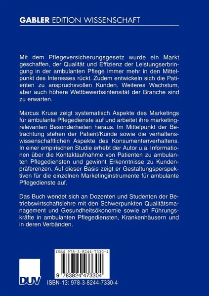 Marcus Kruse zeigt systematisch Aspekte des Marketings für ambulante Pflegedienste auf und arbeitet ihre marketingrelevanten Besonderheiten heraus. Im Mittelpunkt der Betrachtung stehen der Patient/Kunde sowie die verhaltenswissenschaftlichen Aspekte des Konsumentenverhaltens. In einer empirischen Studie erhebt der Autor u.a. Informationen über die Kontaktaufnahme von Patienten zu ambulanten Pflegediensten und gewinnt Erkenntnisse zu Kundenpräferenzen. Auf dieser Basis zeigt er Gestaltungsperspektiven für die einzelnen Marketinginstrumente für ambulante Pflegedienste auf.