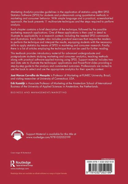 Marketing Analytics provides guidelines in the application of statistics using IBM SPSS Statistics Software (SPSS) for students and professionals using quantitative methods in marketing and consumer behavior. With simple language and a practical, screenshot-led approach, the book presents 11 multivariate techniques and the steps required to perform analysis.