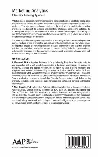 Dr. A. Mansurali is an avid researcher and a well-rounded academician in the field of business management, with special focus on marketing, analytics, and applied research. With innovative and engaging pedagogy, he engages and trains students to understand the current developments in the field and has several academic contributions in the form of publications to his credit. He is proficient in R, Python, Tableau, Power BI, and machine learning algorithms. He is also a certified trainer for R and machine learning from STAR certification. His competence in analytics and research has earned him key roles in sponsored research projects. He has spent over 10 years of teaching management graduates marketing and analytics-related courses and researching the same. He has also received funding from the University Grants Commission to conduct research in microfinance. Prior to academics, Dr. Mansurali served at Janalakshmi Financial Services as Area Head, Sales, in the role of serving financially excluded people and was involved in the activities of customer acquisition for financial services and handling payment cycles. Dr. Mansurali has completed his undergraduate BCA from the PSG College of Arts and Science and MBA from the PSG College of Technology, India, and doctoral degree from Anna University, Chennai, India. He has also completed PGDCA, MSc (Applied Psychology), and MA degrees from Bharathiar University School of Distance Education. He also holds a PGP "Business Analytics and Business Intelligence degree jointly offered by Great Lakes School for Executive Learning McCombs School of Business, The University of Texas at Austin, USA. And he is a lifetime learner having certification in the areas of digital marketing, business intelligence, and analytics. He also engages academic fraternity and industry and trains them in the areas of business intelligence, analytics, and research though MDP and FDPs. Dr. P. Mary Jeyanthi is Associate Professor at the Jaipuria Institute of Management, Jaipur, Rajasthan, India. She has a decade of industry experience as an information technology professional in the banking sector at HDFC Bank Ltd, Business Intelligence Unit, Chennai, Tamil Nadu, India, as well as expertise in business intelligence and forecasting analytics. Dr. Jeyanthi has published many research papers in various national and international reputed journals and has conducted several workshops on research methodology and business intelligence. She has been invited as a speaker at intercollege symposiums and summits across India. She also acts as a resource person for many colleges for soft skills training and workshops related to research paper writing. Dr. Jeyanthi has contributed many articles in magazines related to building human capital and business analytics. She has expertise in the novelty approach of writing and managing analytics with real-time scenarios. Her research interests are in business intelligence and analytics, artificial intelligence, big data analytics, management information systems, data analysis, and business models. Dr. Jeyanthi has done research on A New Implementation of Mathematical Models with Metaheuristic Algorithms for Business Intelligence and has worked on business intelligence and analytics initiatives on high net worth (HNW) portfolios, for which she is responsible for the creation and execution of strategies.