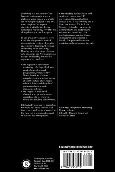 Marketing is at the centre of the business education boom: a million or more people worldwide are studying the subject at any one time. Yet despite widespread discontent with the intellectual standards in marketing, very little has changed over the past thirty years. In this ground-breaking new work, Chris Hackley presents a social-constructionist critique of popular approaches to teaching, theorising and writing about marketing. Drawing on a wide range of up-to-date European and North American studies, Dr Hackley presents his argument on two levels. First, he argues that mainstream marketing's ideologically driven curriculum and research programmes, dominated by North American tradition, reproduce business school myths about the nature of practically relevant theory and the role of professional education in management fields. Second, he suggests a broadened theoretical scope and renewed critical agenda for research, theory and teaching in marketing. Intellectually rigorous yet comprehensible, this work will be of vital importance to all those interested in the future of teaching and research in business and management.