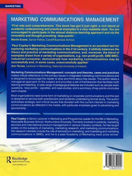 Marketing Communications Management: concepts and theories, cases and practice makes critical reflections on the prime issues in integrated marketing communications and is designed to encourage the reader to stop and think about key issues. The author takes a managerial approach to the subject and provides a set of frameworks that facilitate both learning and teaching. A wide range of pedagogical features is included such as sample exam questions, 'stop points', vignettes, and case studies, and a summary of key points concludes each chapter. Most organizations need some form of marketing or corporate communications and this text is designed to service both practitioners and students undertaking formal study. The author addresses strategic and critical issues that dovetail with the current interest in marketing communications as reflected in the media, with particular emphasis given to advertising and sponsorship.