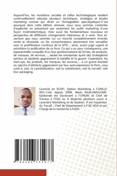 Aujourd'hui, les mutations sociales et celles technologiques rendent continuellement vétustes plusieurs techniques, stratégies et études marketing comme qui dirait un "Armageddon apocalyptique".C'est pourquoi dans cette édition rénovée, nous nous sommes contentés d'expliciter en présentant pas seulement les outils marketing d'une façon mnémotechnique, mais aussi les fondamentaux nouveaux en perspective de différents changements intervenus et à venir. Tout en sachant que nous sommes sur un marché compétitivement inventé, venté et réinventé, ou les consommateurs deviennent très versatiles avec la prolifération continue de la NTIC ; ainsi, avons jugé urgent et prioritaire la publication de ce livre. Ce qui a eu pour conséquence, une exponentielle conquête d'un bon positionnement de firmes, de produits, de marques, de services..., seules les entreprises ayant des stratagèmes pointus et opulents gagneraient la bataille et la guerre. Cependant, les start-ups, les produits, les marques, les services,... à un grand éventail ou spectre d'attributs gagneraient par leur auto-expression le Paris, ceux suite à, soit, la cannibalisation, soit la substitution, soit le narratif, soit leur packaging.