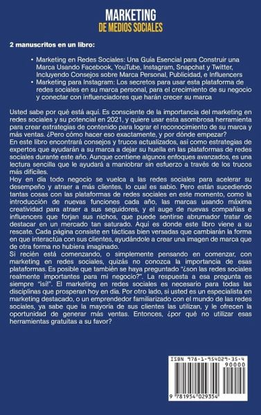 Si siempre ha querido usar las redes sociales para sus fines de marketing, pero siempre se ha sentido perdido, entonces continúe leyendo... Dos manuscritos en un libro:Marketing en Redes Sociales: Una Guía Esencial para Construir una Marca Usando Facebook, YouTube, Instagram, Snapchat y Twitter, Incluyendo Consejos sobre Marca Personal, Publicidad, e Influencers Marketing para Instagram: Los secretos para usar esta plataforma de redes sociales en su marca personal, para el crecimiento de su negocio y conectar con influenciadores que harán crecer su marca ¿Está harto y cansado de no ser capaz de hacer uso de una de las plataformas de marketing más valiosas del mundo? ¿Ha probado un sinfín de otras soluciones, pero nada parece funcionar durante más de algunas semanas? ¿Quiere finalmente decirle adiós a desperdiciar dinero en planes de marketing ineficaces, y descubrir algo que funciona para usted? Si es así, ha venido al lugar correcto. Verá, hacer que las redes sociales funcionen para sus fines de marketing no tiene por qué ser difícil, incluso si ha intentado contratar a un especialista en redes sociales que lo bombardea con terminología, pero que raramente produce resultados. De hecho, es más fácil de lo que piensa. Algunos de los temas y preguntas cubiertos en la primera parte de este libro incluyen:Las principales tendencias de las redes sociales durante 2020 y los cambios que se esperan Cuál plataforma funcionará mejor para usted ¡Cómo usar Facebook, Twitter, Instagram y otros! Las 7 principales herramientas de redes sociales en 2020 ... ¡y mucho, mucho más! Algunos de los temas y preguntas cubiertos en la segunda parte de este libro incluyen:Los cambios de Instagram que tiene que conocer para estar siempre a la vanguardia El por qué está dejando pasar una gran oportunidad al no tener una presencia adecuada en Instagram y las seis mejores maneras de usar las historias para construir su marca Cómo usar los hashtags a su favor (de la manera correcta) Crear contenido consistente que sea persuasivo Cómo vender sus productos en Instagram Cómo la publicidad de Instagram es diferente a la de otras plataformas y qué hacer para que sus anuncios sean efectivos Los secretos poco conocidos para aprovechar el enorme número de seguidores de otros usuarios para disparar su propio éxito en Instagram El futuro de marketing de influencia para que usted siempre esté a la vanguardia ¡Y mucho, mucho más! ¡Tómese un segundo para imaginar cómo se sentirá una vez que vea los frutos de su trabajo, y cómo su familia y amigos reaccionaron cuando les muestre lo bien que ha logrado hacer que las redes sociales funcionen para usted! Por lo tanto, incluso si usted es totalmente nuevo en este juego, puede lograr el éxito con el conocimiento que obtendrá de este libro. ¡Obtenga este libro ahora para aprender más acerca del marketing en redes sociales!