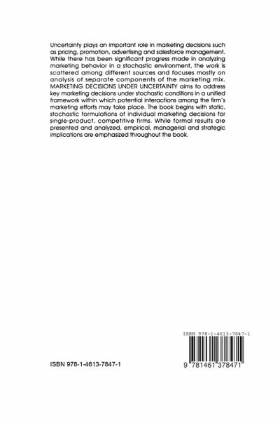 Remarkable advance in quantitative marketing research in the last two decades, incorporating applied microeconomic theories, operations research and management applications, has brought the field of marketing alongside with finance, accounting and productionto within an executive'sreach for a sophisticatedtoolbox for decision making in an increasingly competitive and complex business environment. A quick look at Marketing, a recently published book edited by Eliashberg and Lilien would indicate even to the casual reader the extent of such methodological progress made by marketing scholars. Even in such an impressive and nearly exhaustive collection oftopics, with the notable exception pointed out by the editors of applicationsofthe scanner data, and in spite of the reference to it, an important omission is related to the issues ofmarketing decisions under conditions ofuncertainty. It is fairly obvious to the marketing executive and academician alike to recognize the important role uncertaintyplays in marketingdecisions such as pricing, promotion, advertising, sales force management, and others. The major purpose of this study is to address certain major marketing decision variables within the general context of an uncertain environment. While there have been significant progresses in analyzing marketing behaviors in a stochastic environment,the sourcesscatteramong differentmanagementandmarketingjoumals; and to the extent that these issues are addressed at all, they have aimed mainly at each separate, specifictopic at a time. Thus, our effort to bring these studies together in the same framework should facilitate our in-depth analysis of these important phenomena.
