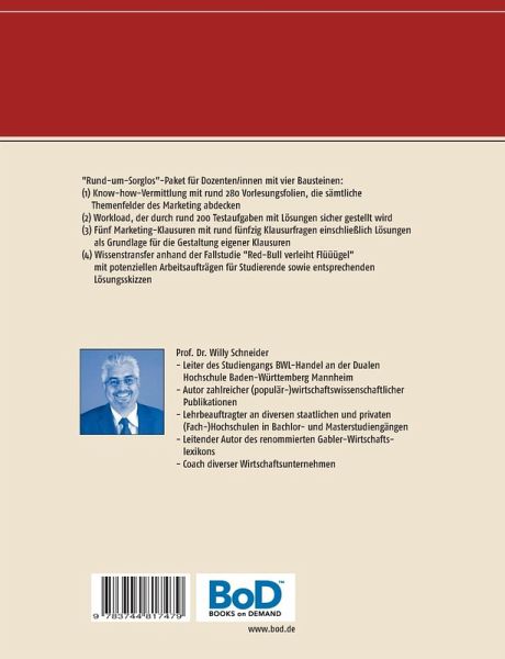 "Rund-um-Sorglos"-Paket für Dozenten/innen mit vier Bausteinen: (1) Know-how-Vermittlung mit rund 280 Vorlesungsfolien, die sämtliche Themenfelder des Marketing abdecken(2) Workload, der durch rund 200 Testaufgaben mit Lösungen sichergestellt wird(3) Fünf Marketing-Klausuren mit rund fünfzig Klausurfragen einschließlich Lösungen als Grundlage für die Gestaltung eigener Klausuren(4) Wissenstransfer anhand der Fallstudie "Red-Bull verleiht Flüüügel" mit potenziellen Arbeitsaufträgen für Studierende sowie entsprechende Lösungsskizzen