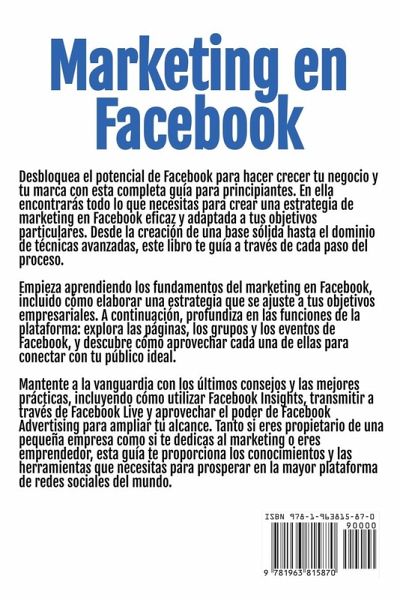 Marketing en Facebook ¿Te cuesta dar a conocer tu empresa en Facebook? ¿Estás listo para liberar el poder del marketing en redes sociales pero no sabes por dónde empezar? Este libro es tu guía para transformar tu presencia en Facebook de invisible a influyente. Repleto de las últimas estrategias y las mejores prácticas, este libro te lleva de la mano y te muestra paso a paso cómo crear un plan de marketing en Facebook ganador. Aprenderás a crear contenidos atractivos, a interactuar con tu público objetivo y a utilizar todas las funciones que Facebook te ofrece: desde optimizar tus páginas y crear grupos dinámicos hasta organizar eventos impactantes y lanzarlos en directo para captar la participación en tiempo real. Centrado en ofrecer consejos prácticos, el libro también revela cómo descifrar el comportamiento de tu público mediante Facebook Insights, lo que te proporciona las herramientas para comprender qué funciona y qué no. Descubrirás los secretos para hacer de Facebook Live una parte interesante de tu estrategia y verás cómo utilizarlo para crear conexiones más profundas con tus seguidores. Además, el libro se sumerge en el arte de la publicidad en Facebook, desglosando las complejidades de las campañas publicitarias para que puedas obtener resultados específicos, aumentar tu alcance y convertir a los espectadores ocasionales en clientes fieles. Tanto si eres propietario de una pequeña empresa como si te dedicas al marketing o eres emprendedor, esta guía te proporciona todo lo que necesitas para triunfar en la mayor plataforma social del mundo. Se acabaron las suposiciones y las vueltas de tuerca: sólo estrategias claras y prácticas para mejorar la presencia de tu marca, conectar con más clientes y convertir Facebook en una poderosa herramienta para el éxito de tu negocio. Prepárate para llevar tu negocio al siguiente nivel. Pide tu ejemplar hoy mismo y transforma tu enfoque del marketing en redes sociales.