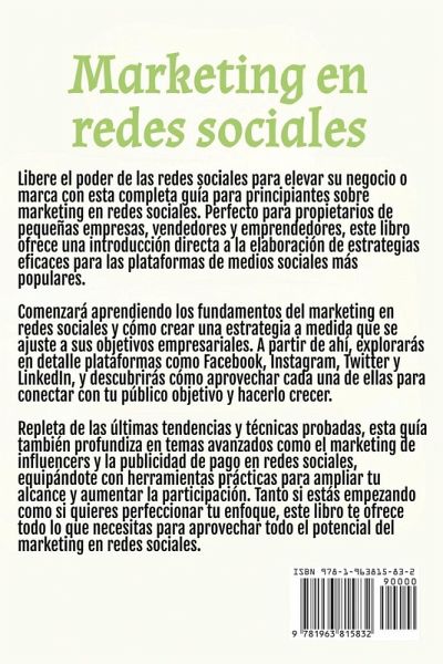 Marketing en redes sociales ¿Está preparado para llevar su negocio o marca al siguiente nivel utilizando el poder de las redes sociales? Tanto si eres propietario de una pequeña empresa como si te dedicas al marketing o eres emprendedor, este libro es tu guía paso a paso para dominar el mundo en constante evolución del marketing en redes sociales. Descubrirás cómo crear una estrategia ganadora adaptada a tus objetivos, aprovechar las principales plataformas como Facebook, Instagram, Twitter y LinkedIn y llegar al público adecuado en el momento adecuado. Esta guía para principiantes desglosa los puntos fuertes de cada plataforma y te muestra cómo maximizar tu presencia, aumentar la participación y fidelizar a tus seguidores. Pero no se queda ahí. También aprenderás a aprovechar las tácticas más avanzadas, como las asociaciones con personas influyentes y la publicidad dirigida, para amplificar tu mensaje y destacar en el abarrotado espacio digital. Con consejos fáciles de seguir, sugerencias prácticas y perspectivas actualizadas, este libro te dota de los conocimientos y la confianza necesarios para construir tu marca y obtener resultados reales. ¿Listo para transformar tus redes sociales? Hazte con tu ejemplar hoy mismo y empieza a liberar todo el poder del marketing en redes sociales.