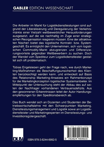 Die Anbieter im Markt für Logistikdienstleistungen sind aufgrund der Liberalisierung und Deregulierung der Verkehrsmärkte einer Vielzahl wettbewerblicher Herausforderungen ausgesetzt, auf die sie nachhaltig im Zuge einer strategischen Reorganisation reagieren müssen. Eine der attraktivsten Nischen bietet das logistische Kontrakt- bzw. Systemgeschäft. Es ermöglicht den Unternehmen, sich vom logistischen Commodity-Markt abzugrenzen und Differenzierungsvorteile gegenüber Wettbewerbern zu suchen. Doch der Wandel vom Spediteur zum Logistikdienstleister gestaltet sich oft problematisch. Tobias Engelsleben geht der Frage nach, wie durch Marketing-Maßnahmen die Beschaffungsunsicherheit des Klienten berücksichtigt werden kann, und entwickelt auf Basis des Relationship Marketing-Ansatzes ein Rahmenkonzept für die Marketingkonzeption logistischer Systemanbieter. Im Mittelpunkt der Untersuchung steht der Abbau des auf seiten der Nachfrager vorhandenen Vertrauensdefizits. Aus den gewonnenen Erkenntnissen leitet der Autor Handlungsempfehlungen für den Speditionsbereich ab.