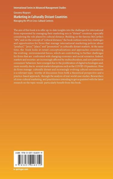 The aim of this book is to offer up-to-date insights into the challenges for international firms represented by managing their marketing mix in "distant" countries, especially considering the role played by cultural distance. Building on the famous McCarthy's "4Ps," and on the concept of "cultural distance," the book outlines some key challenges and opportunities for firms that manage international marketing policies about "product," "price," "place," and "promotion" in culturally distant markets. At the same time, the book looks at extant conceptualizations and approaches considering the evolving environmental forces, which are contributing to further challenges for firms that are confronted with changing economic and social scenarios. Indeed, markets and societies are increasingly affected by multiculturalism, and new patterns in consumers' behaviors have emerged due to the proliferation of digital technologies and, more recently,due to several market disruptions such as the COVID-19 pandemic. How do firms manage culturally distant and increasingly evolving cultural environments is a relevant topic worthy of discussion from both a theoretical perspective and a practice-based approach, through the analysis of real-world case studies. Researchers of cross-cultural marketing and practitioners intending to get acquainted with the latest research on the topic would particularly benefit from this book.