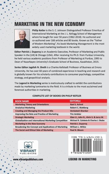Legend in Marketing: Marketing in the New Economy by Philip Kotler Unlock the secrets to successful marketing in the digital age with Legend in Marketing: Marketing in the New Economy by Philip Kotler. This groundbreaking book offers a comprehensive guide to navigating the rapidly evolving marketing landscape. Philip Kotler, a legendary figure in marketing, presents an in-depth analysis of the major shifts impacting today's market. Inside, you'll find: -- Cutting-Edge Strategies: Explore innovative approaches to digital marketing and consumer engagement. -- Real-World Examples: Learn from detailed case studies of companies that have thrived in the new economy. -- Expert Advice: Implement actionable insights to transform your marketing efforts and drive growth. Perfect for marketing professionals, business executives, and entrepreneurs, this book is your roadmap to mastering the art of marketing in a world where change is the only constant. Discover how to stay ahead of trends and harness new opportunities with Kotler's expert guidance.Legend in Marketing: Marketing in the New Economy by Philip Kotler Unlock the secrets to successful marketing in the digital age with Legend in Marketing: Marketing in the New Economy by Philip Kotler. This groundbreaking book offers a comprehensive guide to navigating the rapidly evolving marketing landscape. Philip Kotler, a legendary figure in marketing, presents an in-depth analysis of the major shifts impacting today's market. Inside, you'll find: -- Cutting-Edge Strategies: Explore innovative approaches to digital marketing and consumer engagement. -- Real-World Examples: Learn from detailed case studies of companies that have thrived in the new economy. -- Expert Advice: Implement actionable insights to transform your marketing efforts and drive growth. Perfect for marketing professionals, business executives, and entrepreneurs, this book is your roadmap to mastering the art of marketing in a world where change is the only constant. Discover how to stay ahead of trends and harness new opportunities with Kotler's expert guidance.