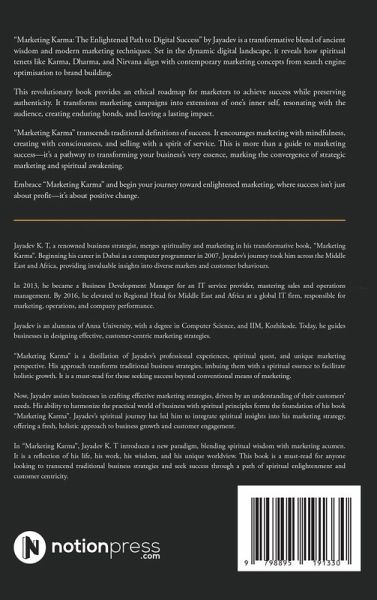 Marketing Karma: The Enlightened Path to Digital Success" by Jayadev is a transformative blend of ancient wisdom and modern marketing techniques. Set in the dynamic digital landscape, it reveals how spiritual tenets like Karma, Dharma, and Nirvana align with contemporary marketing concepts from search engine optimisation to brand building. This revolutionary book provides an ethical roadmap for marketers to achieve success while preserving authenticity. It transforms marketing campaigns into extensions of one's inner self, resonating with the audience, creating enduring bonds, and leaving a lasting impact. "Marketing Karma" transcends traditional definitions of success. It encourages marketing with mindfulness, creating with consciousness, and selling with a spirit of service. This is more than a guide to marketing success-it's a pathway to transforming your business's very essence, marking the convergence of strategic marketing and spiritual awakening. Embrace "Marketing Karma" and begin your journey toward enlightened marketing, where success isn't just about profit-it's about positive change.