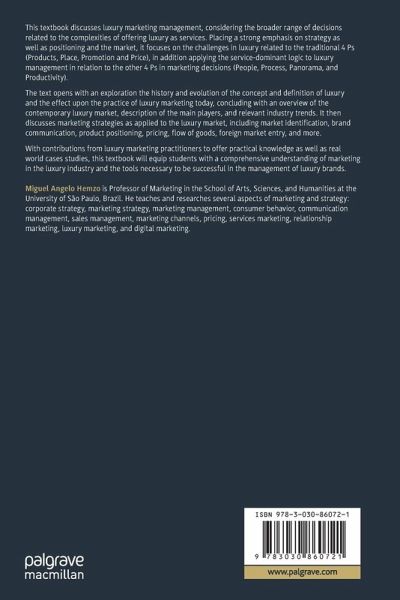 This textbook discusses luxury marketing management, considering the broader range of decisions related to the complexities of offering luxury as services. Placing a strong emphasis on strategy as well as positioning and the market, it focuses on the challenges in luxury related to the traditional 4 Ps (Products, Place, Promotion and Price), in addition applying the service-dominant logic to luxury management in relation to the other 4 Ps in marketing decisions (People, Process, Panorama, and Productivity).