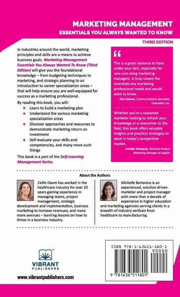 A Practical Guide to Strategic Planning, Marketing Budgets, Digital Marketing, and Customer Relationships. A modern marketer's playbook to create value for your organization and its customers In industries around the world, marketing principles and skills are a means to achieve business goals. Marketing Management Essentials (Third Edition) will give you the foundational knowledge - from budgeting techniques to marketing strategic planning to an introduction to career specialization areas - that will help ensure you are equipped for success as a marketing professional. In this book you will:Learn how to build a marketing plan, Get an understanding of the various marketing specialization areas, Pick up approaches and resources to demonstrate marketing return on investment, Grasp how to self-evaluate your skills and competencies The book also touches upon topics like market types, philosophies, strategic planning and marketing, various types of audits (internal, external and strategic), value chain analysis, outsourcing, marketing research (planning, approaches, research devices, ethics), relationships with customers (relationship marketing, types of customers, customer retention, digital marketing, and many more. These are coupled with summaries and quizzes at the end of every chapter, making the book a well-rounded guide for the readers. The third edition of the book also contains three new chapters, each chapter bringing concepts like essential marketing skills you might need now and in the future, forming a marketing budget to judiciously allocate the expenses, and marketing return on investment (mROI). These chapters will surely help the readers bolster their understanding of marketing management by constructing a more robust, well-rounded foundation. By the end of this book, you will have the tools and understanding to create or nurture a revenue-generating department for your organization. You will have a strong foundation, helping you with a head start in your career as a professional in the marketing sphere.