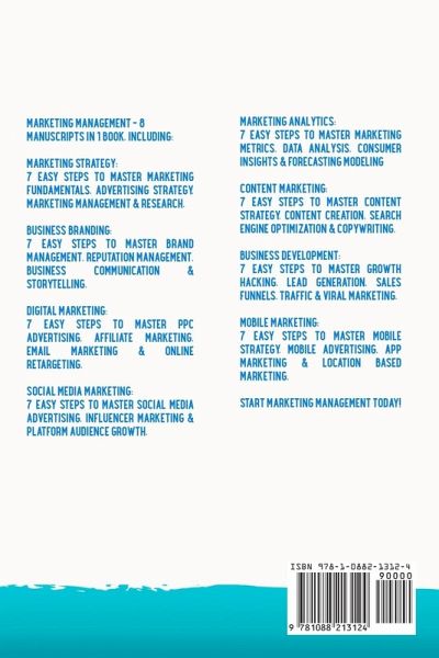 MARKETING MANAGEMENT - 8 MANUSCRIPTS IN 1 BOOK, INCLUDING: 1) MARKETING STRATEGY: 7 Easy Steps to Master Marketing Fundamentals, Advertising Strategy, Marketing Management & Research. 2) BUSINESS BRANDING: 7 Easy Steps to Master Brand Management, Reputation Management, Business Communication & Storytelling. 3) DIGITAL MARKETING: 7 Easy Steps to Master PPC Advertising, Affiliate Marketing, Email Marketing & Online Retargeting. 4) SOCIAL MEDIA MARKETING: 7 Easy Steps to Master Social Media Advertising, Influencer Marketing & Platform Audience Growth. 5) MARKETING ANALYTICS: 7 Easy Steps to Master Marketing Metrics, Data Analysis, Consumer Insights & Forecasting Modeling. 6) CONTENT MARKETING: 7 Easy Steps to Master Content Strategy, Content Creation, Search Engine Optimization & Copywriting. 7) BUSINESS DEVELOPMENT: 7 Easy Steps to Master Growth Hacking, Lead Generation, Sales Funnels, Traffic & Viral Marketing. 8) MOBILE MARKETING: 7 Easy Steps to Master Mobile Strategy, Mobile Advertising, App Marketing & Location Based Marketing. START MARKETING MANAGEMENT TODAY!