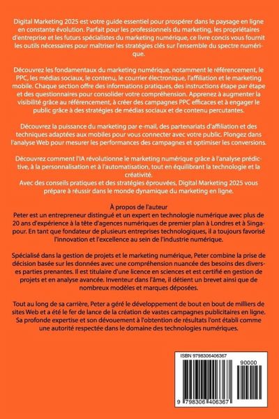 Digital Marketing 2025 est votre guide essentiel pour prospérer dans le paysage en ligne en constante évolution. Parfait pour les professionnels du marketing, les propriétaires d'entreprise et les futurs spécialistes du marketing numérique, ce livre concis vous fournit les outils nécessaires pour maîtriser les stratégies clés sur l'ensemble du spectre numérique. Explorez les fondamentaux du marketing numérique, notamment le référencement, le PPC, les médias sociaux, le contenu, le courrier électronique, l'affiliation et le marketing mobile. Chaque section offre des informations pratiques, des instructions étape par étape et des questionnaires pour consolider votre compréhension. Apprenez à augmenter la visibilité grâce au référencement, à créer des campagnes PPC efficaces et à engager le public grâce à des stratégies de médias sociaux et de contenu percutantes. Découvrez la puissance du marketing par e-mail, des partenariats d'affiliation et des techniques adaptées aux mobiles pour vous connecter avec votre public. Plongez dans l'analyse Web pour mesurer les performances des campagnes et optimiser les conversions. Découvrez comment l'IA révolutionne le marketing numérique grâce à l'analyse prédictive, à la personnalisation et à l'automatisation, tout en équilibrant la technologie et la créativité. Avec des conseils pratiques et des stratégies éprouvées, Digital Marketing 2025 vous prépare à réussir dans le monde dynamique du marketing en ligne.