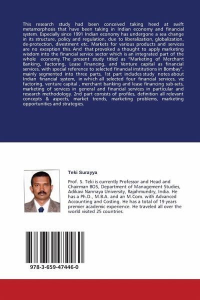 This research study had been conceived taking heed at swift metamorphosis that have been taking in Indian economy and financial system. Especially since 1991 Indian economy has undergone a sea change in its structure, policy and regulation, due to liberalization, globalization, de-protection, divestment etc. Markets for various products and services are no exception this. And that provoked a thought to apply marketing wisdom into the financial service sector which is an integrated part of the whole economy. The present study titled as "Marketing of Merchant Banking, Factoring, Lease Financing, and Venture capital as financial services, with special reference to selected financial institutions in Bombay", mainly segmented into three parts, 1st part includes study notes about Indian financial system, in which all selected four financial services, viz factoring, venture capital , merchant banking and lease financing sub-sets, marketing of services in general and financial services in particular and research methodology. 2nd part consists of profiles, definition all relevant concepts & aspects, market trends, marketing problems, marketing opportunities and strategies.