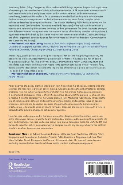 Policy analysts and policy planners should start from the premise that obstacles, uncertainties and surprises are important features of policy-making. All public policies should be treated as complex problems, from the outset. Complexity theorists start from the premise that complex policies are ill-defined and ambiguous. There is often little consensus about what the problem is, let alone how to resolve it. Into the complexity of the wicked problem fray, Marketing Public Policy introduces the role of communication scholars and practitioners whose models and practices focus on people, processes, opinions and behaviour as causes of organisational complexity. Communication practice's role is to provide ideas on how to navigate, diagnose and interpret issues with a view to persuading the public to change its behaviour or opinions. From the case studies presented in this book, we see that despite rationally excellent macro- and micro-planning of policies to win the hearts and minds of citizens, public policies still deteriorate into hurts and minefields. The case studies are drawn from China, Indonesia, India, the USA, the UK and Europe to show that policy-making is always a complex issue in any country, whatever the political structure, whether democracy or communism.