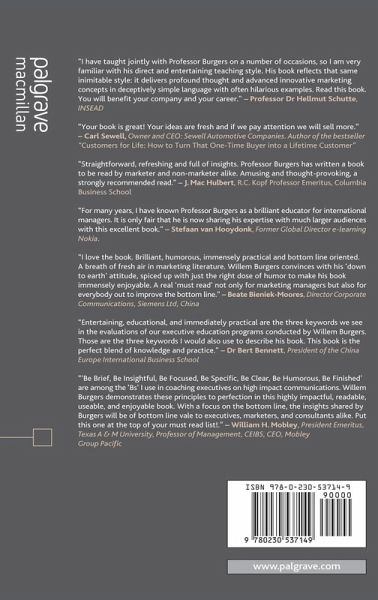 "Be Brief, Be Insightful, Be Focused, Be Specific, Be Clear, Be Humorous, Be Finished' are among the 'Be's' I use in coaching executives on high impact communications. Willem Burgers demonstrates these principles to perfection in this highly impactful, readable, useable and enjoyable book. With a focus on the bottom line. The insights shared by Burgers will be of bottom line vale to executives, marketers and consultants alike. Put this one at the top of your must read list!" William H. Mobley, President Emeritus, Texas A& M University, Professor of Management, CEIBS, CEO, Mobley Group Pacific