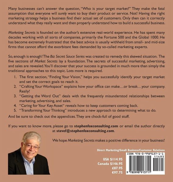 Many businesses can't answer the question, "Who is your target market?" They make the fatal assumption that everyone will surely want to buy their product or service. Not! Having the right marketing strategy helps a business fi nd their actual set of customers. Only then can it correctly understand what they really want and then properly understand how to build a successful business. Marketing Secrets is founded on the author's extensive real-world experience. He has spent many decades working with all sorts of companies, primarily the Fortune 500 and the Global 1000. He has become extremely frustrated that the best advice is usually withheld from small- and mid-size firms that cannot afford the exorbitant fees demanded by so-called marketing experts. So, enough is enough! The Biz Secret Sauce Series was created to remedy this skewed situation. The five sections of Market Secrets lay a foundation. The secrets of successful marketing, advertising, and sales are revealed. You'll discover that your success is grounded in much more than simply the traditional approaches to this topic. Lots more is required. 1. The first section, "Finding Your Vision," helps you successfully identify your target market and set the correct goals to reach it. 2. "Crafting Your Workspace" explains how your offi ce can make…or break…your company. Really! 3. "Getting the Word Out" deals with the frequently misunderstod relationships between marketing, advertising, and sales. 4. "Caring for Your Key Asset" reveals how to keep customers coming back. 5. "Transforming Your Thinking" introduces a new approach to determining what to do. And be sure to check out the appendices. They are chock-full of good stuff. If you want to know more, please go to stephenfoxconsulting.com or email the author directly at stevef@stephenfoxconsulting.com. We hope Marketing Secrets makes a positive difference in your business!