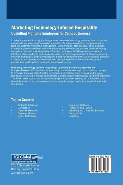 In today's hospitality industry, the integration of marketing technology reshapes how businesses engage with customers and streamline operations. To remain competitive, companies rely on tools like customer relationship management (CRM) systems, data analytics, and automation to enhance guest experiences and drive brand loyalty. However, the success of this technology depends on the skills and adaptability of frontline employees. Upskilling these employees to effectively utilize marketing technologies is crucial for delivering personalized service, optimizing customer interactions, and staying ahead in a highly competitive market. As the industry continues to innovate, empowering frontline teams with the right digital skills will ensure new growth opportunities and long-term success in the hospitality sector. Marketing Technology-Infused Hospitality: Upskilling Frontline Employees for Competitiveness offers solutions for hospitality businesses seeking to incorporate technology to empower and upskill their frontline workers for a competitive edge. It examines the use of technology for customer service and interaction, and the future of technology-integrated hospitality. This book covers topics such as artificial intelligence, customer service, and social media, and is a useful resource for business owners, tourism professionals, marketers, academicians, and researchers.