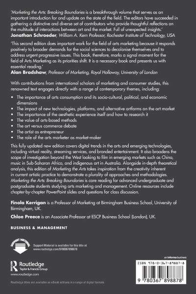 This fully updated new edition covers digital trends in the arts and emerging technologies, including virtual reality, streaming services, and branded entertainment. It also broadens the scope of investigation beyond the West looking to film in emerging markets such as China, music in Sub-Saharan Africa, and indigenous art in Australia. Alongside in-depth theoretical analysis, this edition of Marketing the Arts takes inspiration from the creativity inherent in current artistic practice to demonstrate a plurality of approaches and methodologies. Marketing the Arts: Breaking Boundaries is core reading for advanced undergraduate and postgraduate students studying arts marketing and management. Online resources include chapter-by-chapter PowerPoint slides and questions for class discussion.