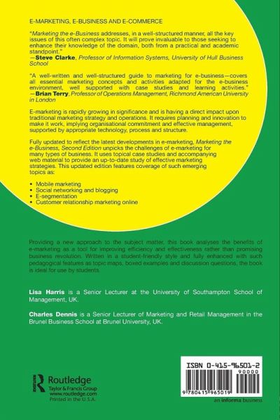 E-marketing is rapidly growing in significance and is having a direct impact upon traditional marketing strategy and operations. It requires planning and innovation to make it work, implying organisational commitment and effective management, supported by appropriate technology, process and structure. Fully updated to reflect the latest developments in e-marketing, Marketing the eBusiness, Second Edition unpicks the challenges of e-marketing for many types of business. It uses topical case studies and accompanying web material to provide an up-to-date study of effective marketing strategies. This updated edition features coverage of such emerging topics as: Mobile marketing Social networking and blogging E-segmentation Customer relationship marketing online Providing a new approach to the subject matter, this book analyses the benefits of e-marketing as a tool for improving efficiency and effectiveness rather than promising business revolution. Written in a student-friendly style and fully enhanced with such pedagogical features as topic maps, boxed examples and discussion questions, the book is ideal for use by students.