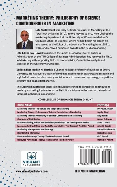 SHELBY D. HUNT Late Shelby D. Hunt was the Jerry S. Rawls and P.W. Horn Professor of Marketing at the Rawls College of Business, Texas Tech University, Lubbock, Texas, USA. A past editor of the Journal of Marketing (1985-87), he was the author of numerous books, including Foundations of Marketing Theory: Toward a General Theory of Marketing (2002), Controversy in Marketing Theory: For Reason, Realism, Truth, and Objectivity (2003), and A General Theory of Competition: Resources, Competences, Productivity, Economic Growth (2000). One of the 250 most frequently cited researchers in economics and business (Thomson-ISI), he wrote numerous articles on competitive theory, strategy, macromarketing, ethics, relationship marketing, channels of distribution, philosophy of science, and marketing theory. Three of his Journal of Marketing articles won the Harold H. Maynard Award for the "best article on marketing theory." His 1994 Journal of Marketing article "Commitment and Trust," with Robert M. Morgan, was the most highly cited article in economics and business in the 1993-2003 decade (Thomson-ISI). For his contributions to theory and science in marketing, he received multiple other distinguished awards.