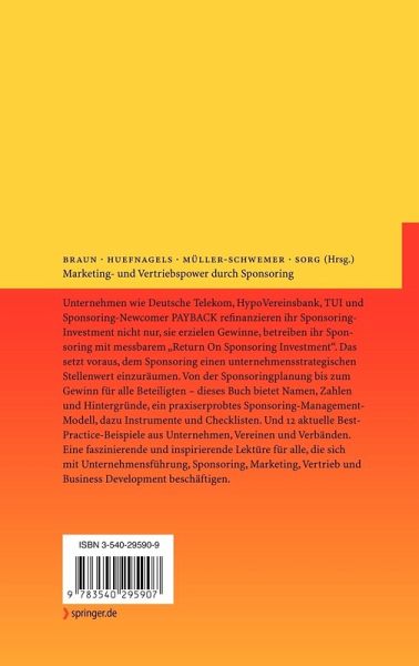 Unternehmen wie Deutsche Telekom, HypoVereinsbank, TUI und Sponsoring-Newcomer PAYBACK refinanzieren ihr Sponsoring-Investment nicht nur, sie erzielen Gewinne, betreiben ihr Sponsoring mit messbarem Return On Sponsoring Investment". Das setzt voraus, dem Sponsoring einen unternehmensstrategischen Stellenwert einzuräumen. Von der Sponsoringplanung bis zum Gewinn für alle Beteiligten dieses Buch bietet Namen, Zahlen und Hintergründe, ein praxiserprobtes Sponsoring-Management-Modell, dazu Instrumente und Checklisten. Und 12 aktuelle Best-Practice-Beispiele aus Unternehmen, Vereinen und Verbänden. Eine faszinierende und inspirierende Lektüre für alle, die sich mit Unternehmensführung, Sponsoring, Marketing, Vertrieb und Business Development beschäftigen.