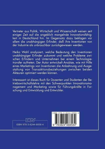 Vertreter aus Politik, Wirtschaft und Wissenschaft weisen seit einiger Zeit auf die angeblich mangelnde Innovationsfähigkeit in Deutschland hin. Im Gegensatz dazu beklagen vor allem die unabhängigen Erfinder, daß ihre Inventionen von der Industrie als unbrauchbar zurückgewiesen werden. Heiko Wahl analysiert, welche Bedeutung den Inventionen unabhängiger Erfinder zukommt und welche Probleme zwischen Erfindern und Unternehmen bei einem Technologietransfer auftreten. Der Autor entwickelt Ansätze, wie mit Hilfe eines Marketings von Inventionen die Anbahnung und Ausgestaltung von Transaktionsbeziehungen zwischen beiden Akteuren optimiert werden können.