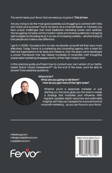 Marketing with Fervor isn't just another marketing book-it's a battle-tested playbook for nonprofits ready to make an unforgettable impact. Written by Mike Farag, founder of Fervor, this book is a heart-driven guide born out of real experiences, like helping a nonprofit in Haiti supercharge its mission through marketing. That moment sparked the creation of Fervor and the approach detailed in these pages. At the heart of the book is Fervor's game-changing Brand Impact Assessment(TM). This isn't about casting a wide net-it's about zeroing in on your Ideal Advocates(TM), the people who are already fired up about your mission and ready to help you move mountains. Mike takes you step-by-step through understanding these advocates, crafting messages that truly connect, and building a strategy that turns those connections into lasting momentum. But Mike doesn't stop there. He knows nonprofits face unique challenges-limited budgets, complex messaging, and audiences that range from donors to volunteers and everyone in between. Through real-world examples and no-fluff advice, he shows how Fervor's approach has helped organizations clarify their voice, amplify their reach, and rally the right people to their cause. The takeaway? This book is your roadmap to building relationships that energize your mission, not drain it. By the last page, you'll have the tools, strategies, and inspiration to turn supporters into advocates and advocates into a movement. Marketing with Fervor is about more than marketing-it's about helping your organization make the most good possible.