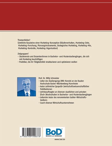 Themenfelder?Sämtliche Bausteine einer Marketing-Konzeption (Käuferverhalten, Marketing-Ziele, Marketing-Forschung, Planungsinstrumente, Strategisches Marketing, Marketing-Mix, Marketing-Kontrolle, Marketing-Organisation)Zielgruppen?- Studierende und Dozenten/innen in Bachelor- und Masterstudiengängen, die sich mit Marketing beschäftigen- Praktiker, die ihr Tätigkeitsfeld strukturieren und optimieren wollen