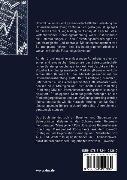 Auf der Grundlage einer umfassenden Aufarbeitung theoretischer und empirischer Ergebnisse der betriebswirtschaftlichen Beratungsforschung entwickelt Kurt Jeschke mit Hilfe aktueller Forschungsansätze der Marketingtheorie einen konzeptionellen Rahmen für das Marketingmanagement der Unternehmensberatung. Unter Berücksichtigung branchen-, unternehmens- und klientenspezifischer Einflussfaktoren werden die Ziele, Strategien und Instrumente eines Marketing (Marketing-Mix) für Unternehmensberatungsdienstleistungen diskutiert. Grundlegende Gestaltungsanforderungen an die Marketingorganisation und das Marketingcontrolling werden ebenso untersucht wie die Herausforderungen an das Qualitätsmanagement für professionell erbrachte Unternehmensberatungsleistungen.